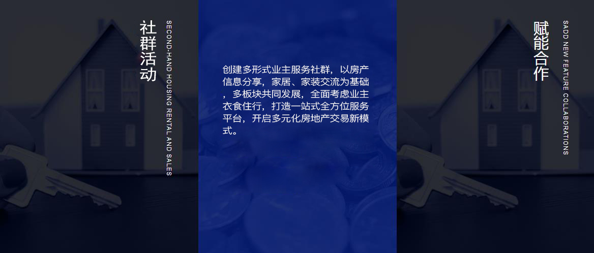 创建多形式业主服务社群,以房产信息分享,家居、家装交流为基础,多板块共同发展,全面考虑业主衣食住行,打造一站式全方位服务平台,开启多元化房地产交易新模式。